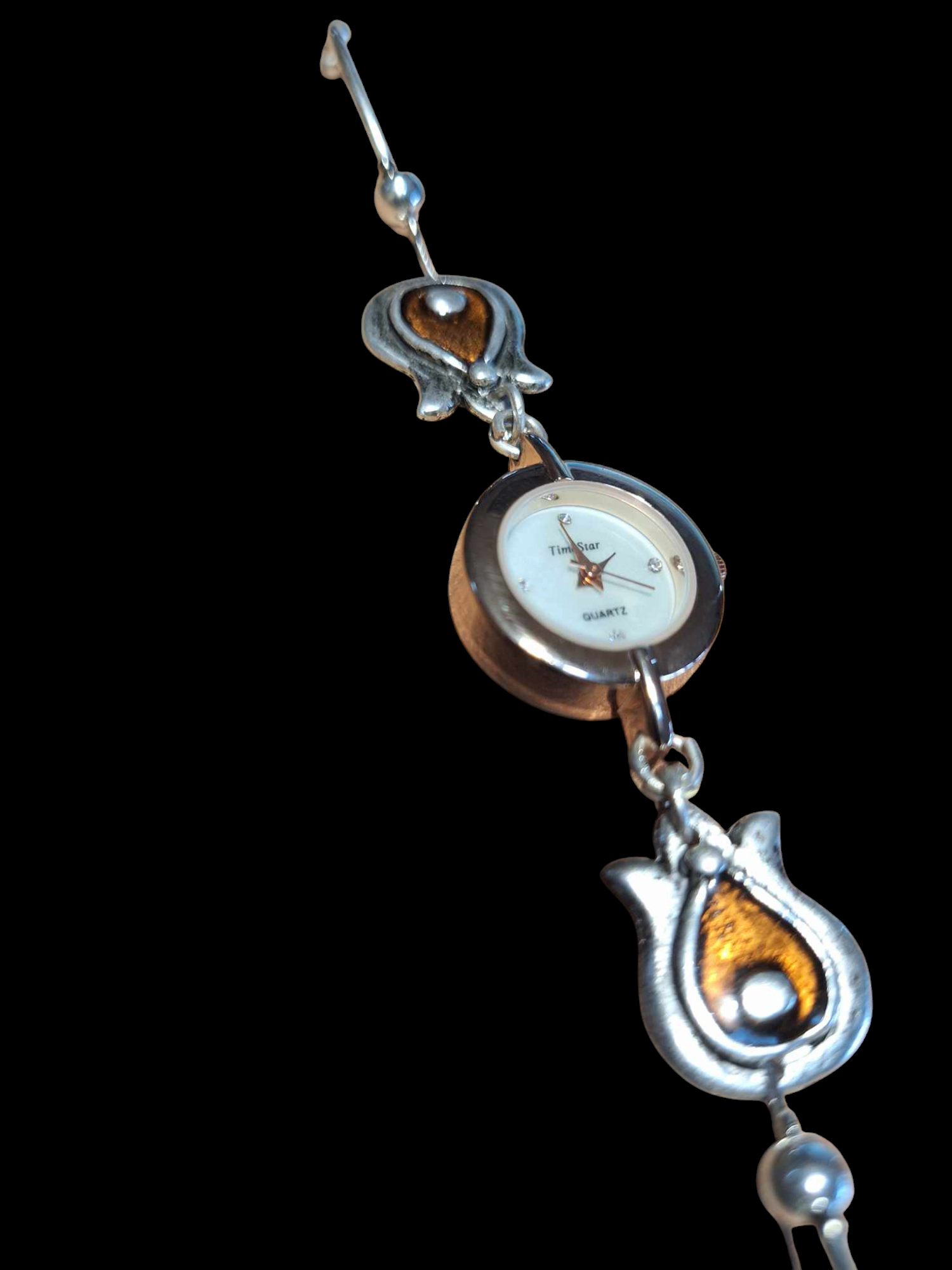 Anyaga: réz alap ezüstözve, amely króm és nikkel mentes, így allergiások is hordhatják/az óra lap nem saját gyártás, így annak allergia mentességét nem tudjuk garantálni
