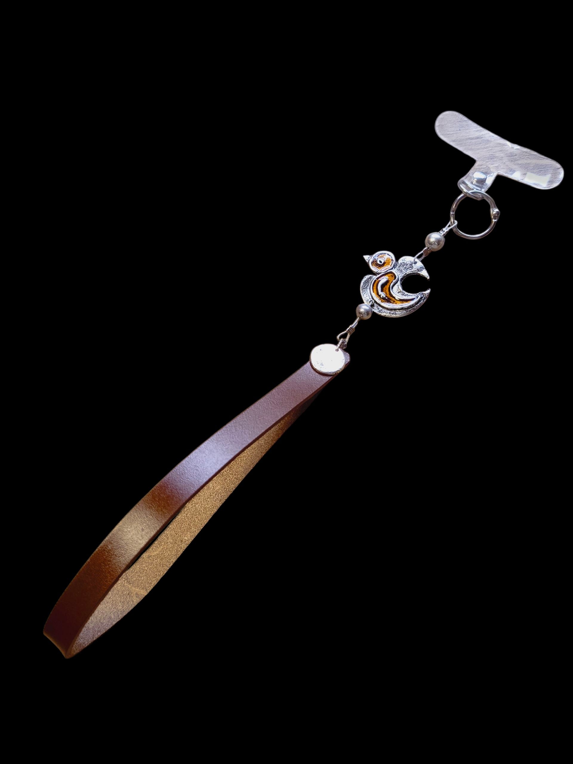 Bögyös galamb csuklóra akasztható valódi bőr telefontartó