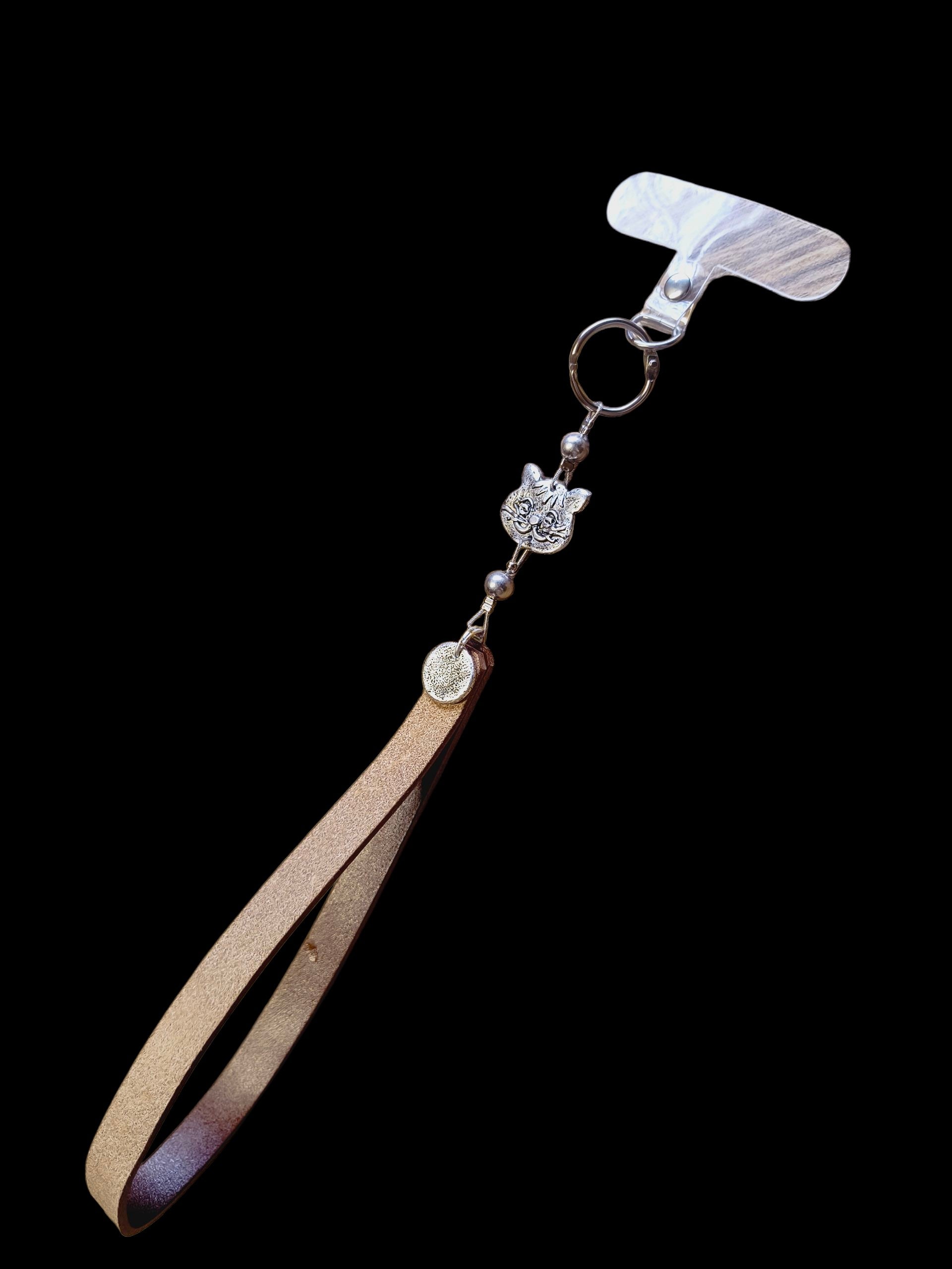 Csuklóra akasztható valódi bőr telefontartó ezüstözött medállal