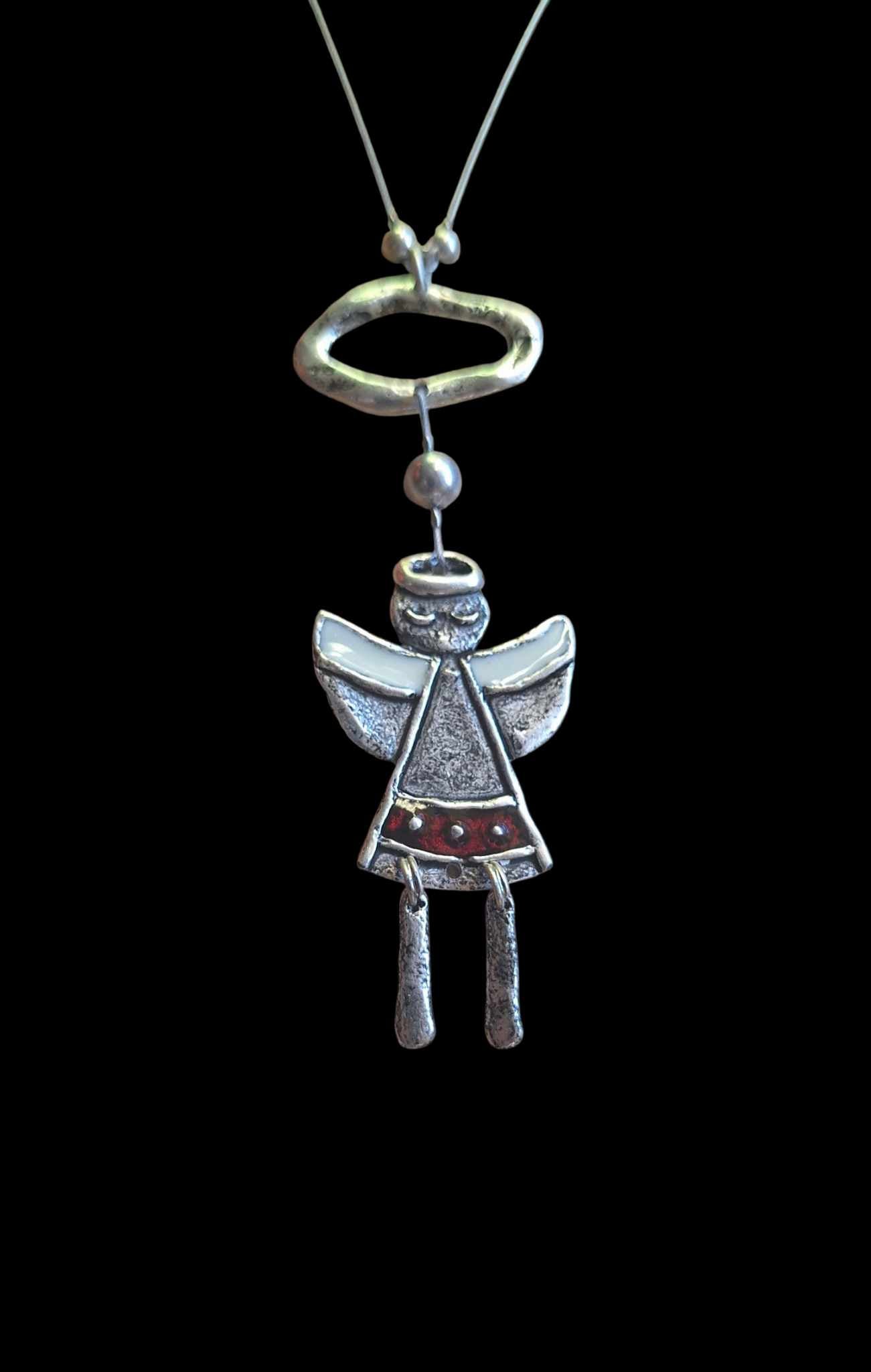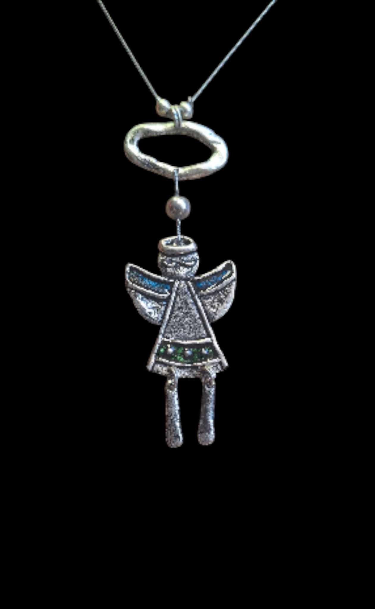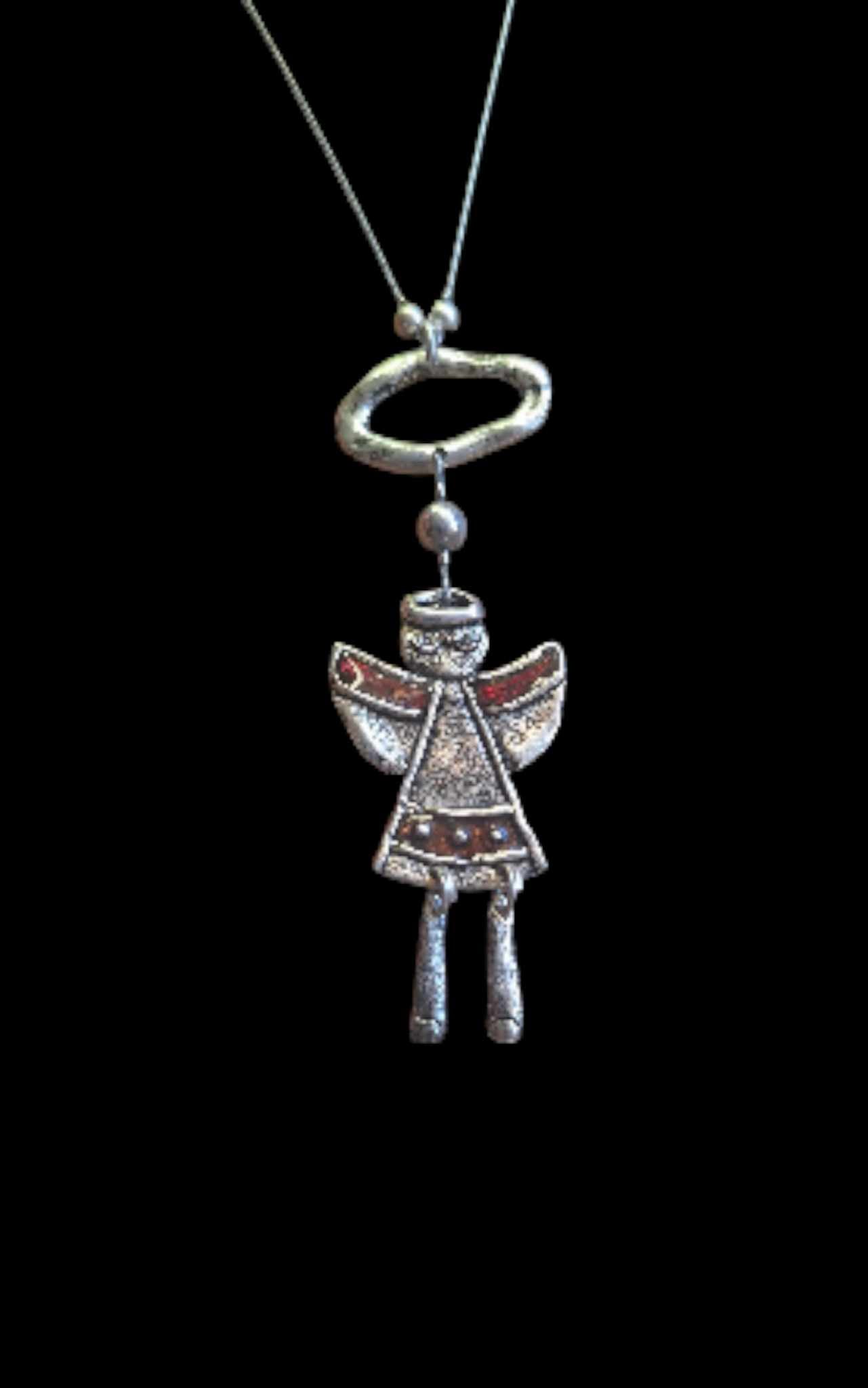 Minta: nagy méretű, ezüst színű, angyal alakú medál hosszú lánconMedál anyaga: réz alap ezüstözve, amely króm és nikkel mentes, így allergiások is hordhatják