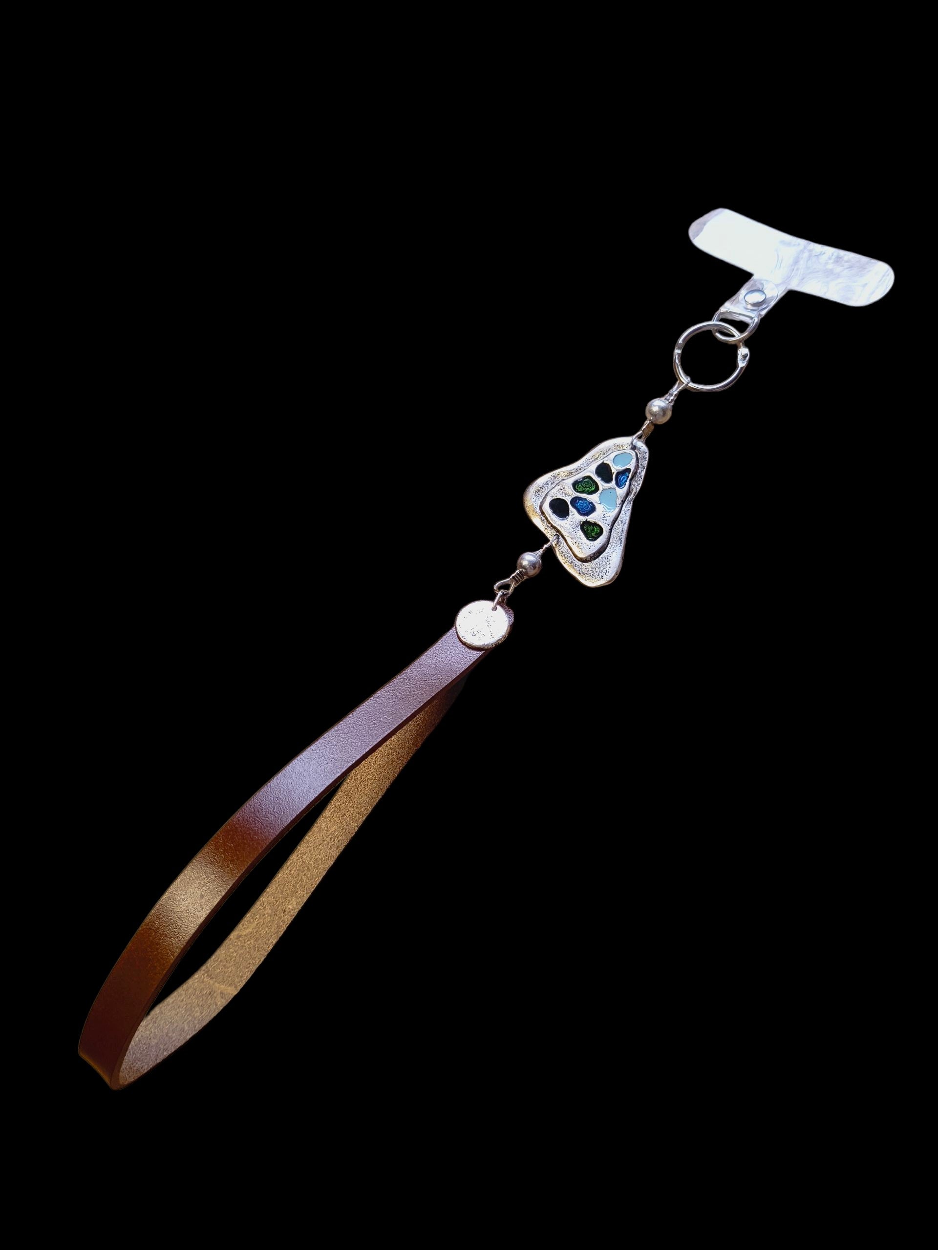 Csuklóra akasztható valódi bőr telefontartó ezüstözött medállal