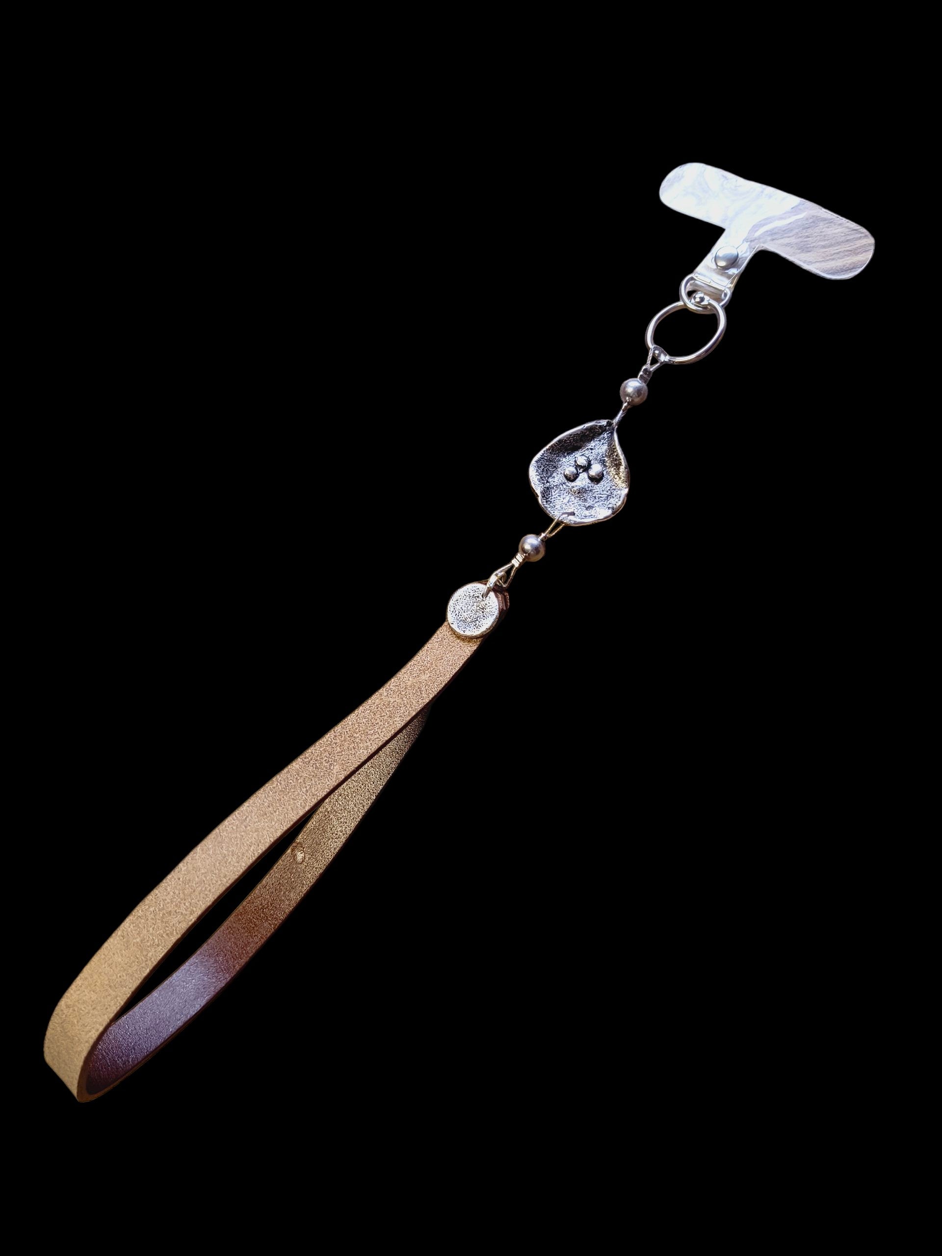 Csuklóra akasztható valódi bőr telefontartó ezüstözött medállal