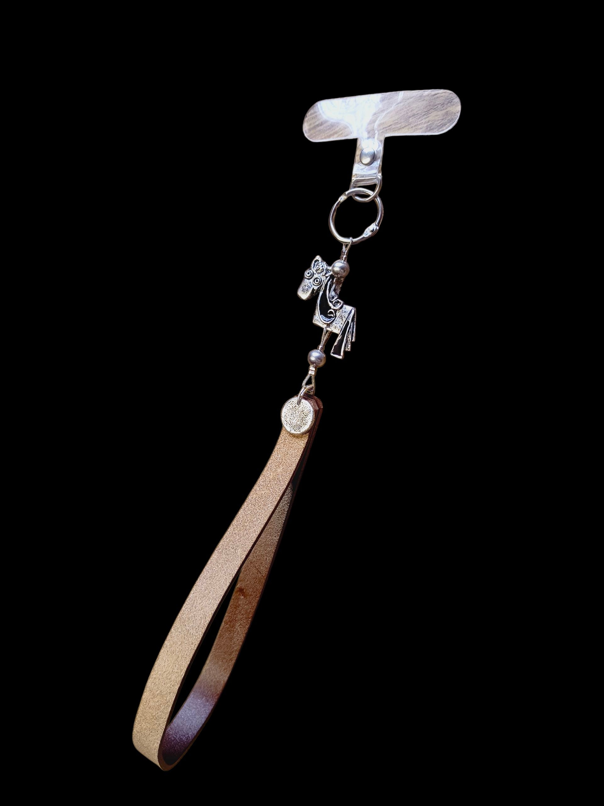 Csuklóra akasztható valódi bőr telefontartó ezüstözött medállal