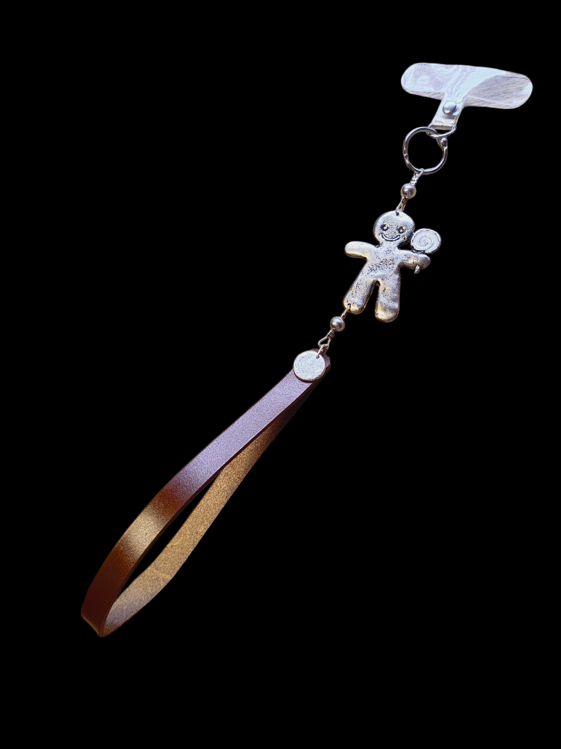 Csuklóra akasztható valódi bőr telefontartó ezüstözött medállal