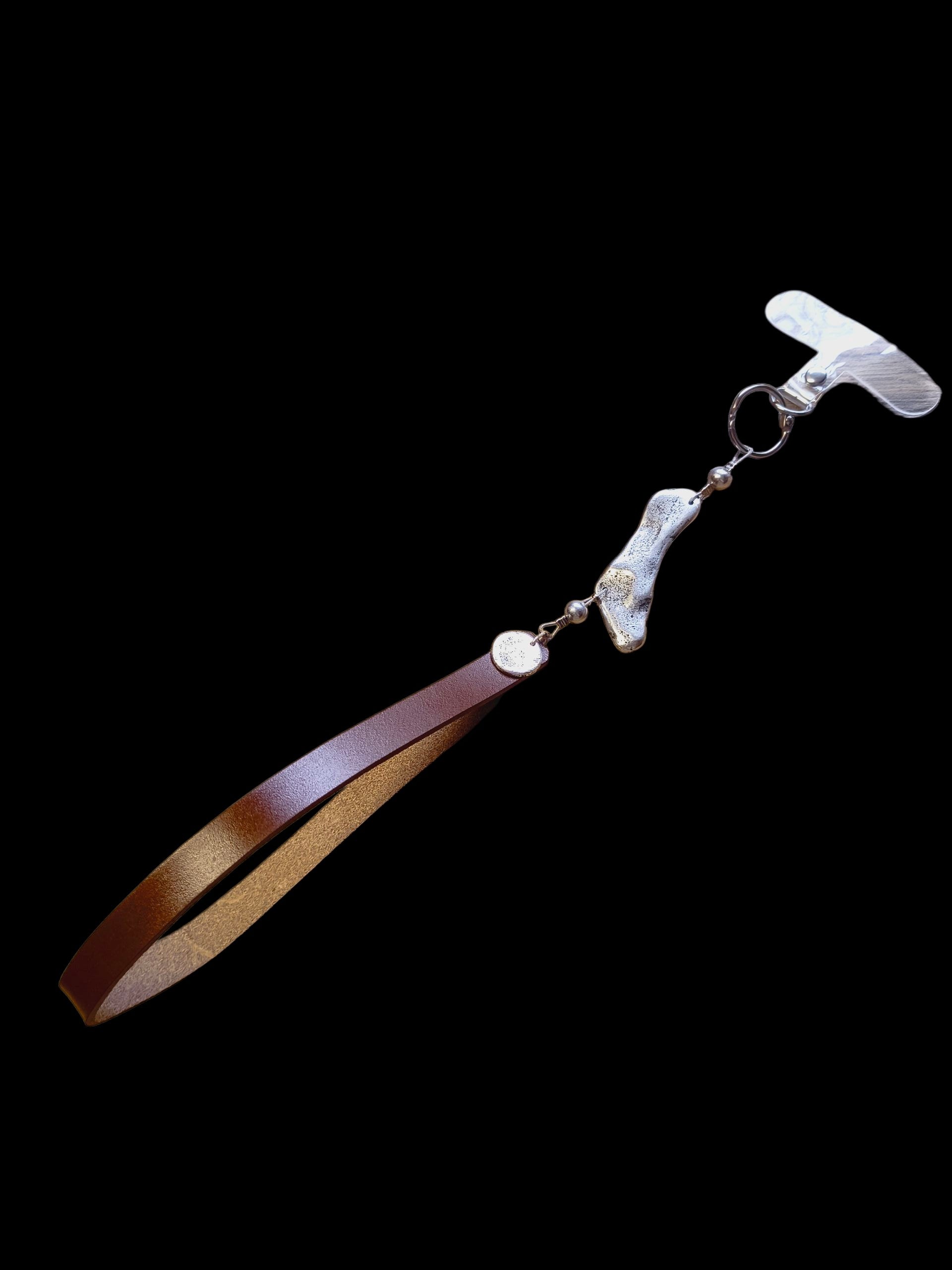 Csuklóra akasztható valódi bőr telefontartó ezüstözött medállal
