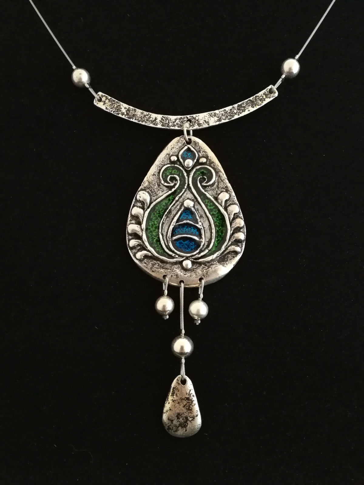 Minta: nagy méretű, ezüst színű, csepp alakú medálMedál anyaga: réz alap ezüstözve, amely króm és nikkel mentes, így allergiások is hordhatják